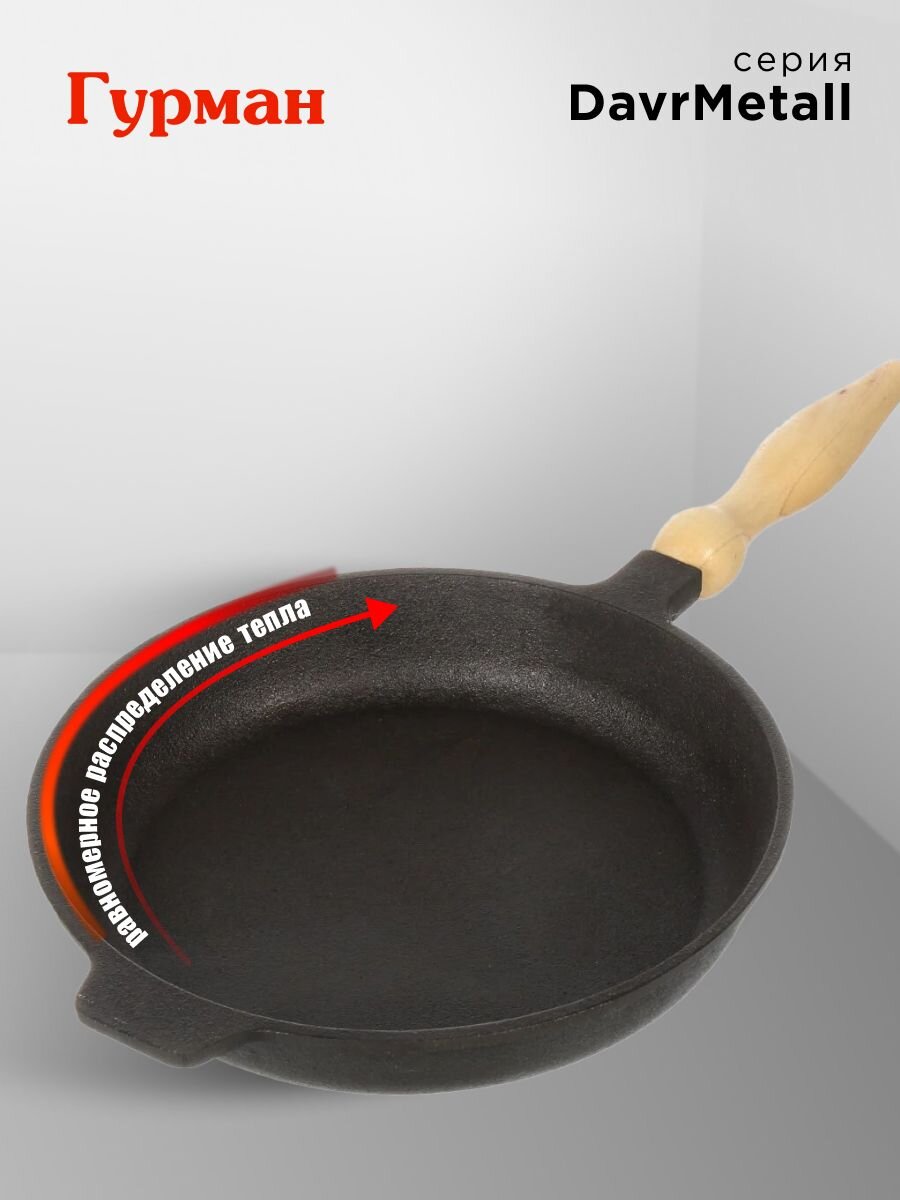 Чугунная сковорода 24 см DavrMetall: идеальный выбор для индукции, съемная деревянная ручка, срок службы 30+ лет, выгодно для дома и дачи.