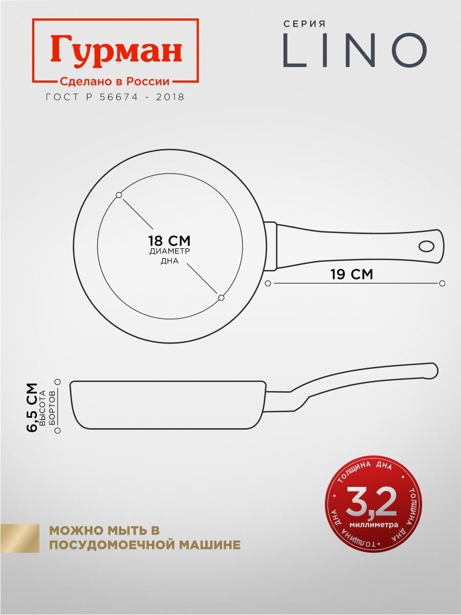 Сковорода Гурман Lino из литого алюминия с антипригарным покрытием PFLUON — оптимальный выбор для тех, кто ищет, какую сковороду купить для индукции или универсального использования. Благодаря толщине дна 3,2 мм и стенок 2,4 мм, жар равномерно распределяется, что позволяет готовить мясо, рыбу, омлеты и оладьи без пригорания. Часто спрашивают: «Подходит ли для посудомоечной машины?» — да, уход максимально простой.