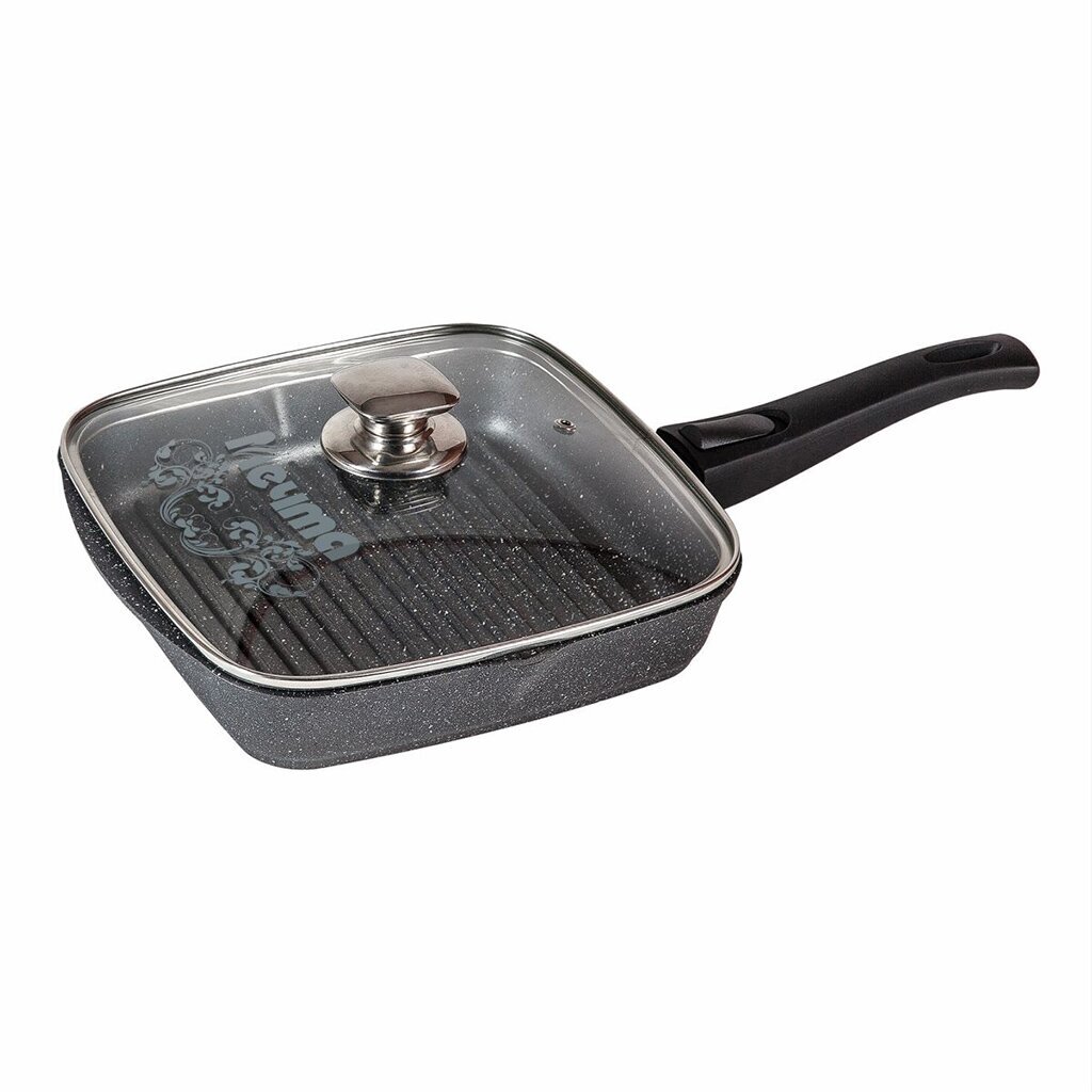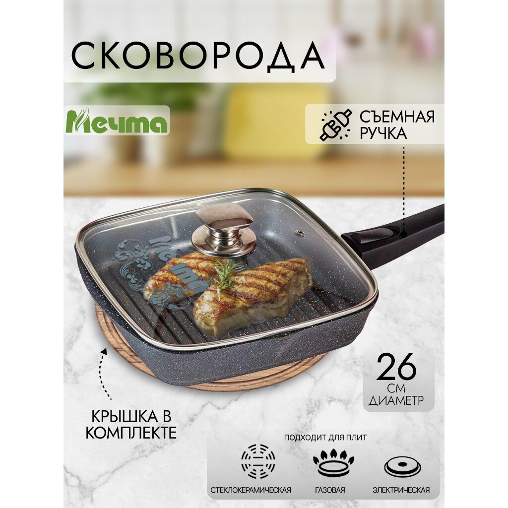 Сковорода-гриль Мечта Гранит 26 см с крышкой — идеальный выбор для сочного мяса и рыбы без лишнего масла: антипригарное покрытие, съемная ручка, срок службы до 5 лет.