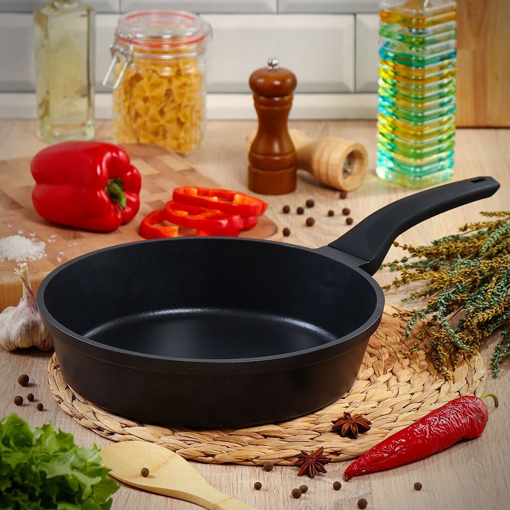 Сковорода из литого алюминия диаметром 28 см от коллекции Гурман Verde — это современное решение для тех, кто ищет, какую сковороду выбрать для индукционной плиты или универсального использования. Благодаря прочному литому корпусу и антипригарному тефлоновому покрытию, она обеспечивает минимальный расход масла и лёгкую чистку, что актуально для ежедневной готовки. Глубокая форма и оптимальная высота борта (65 мм) позволяют готовить блюда для всей семьи — от омлета до жареного мяса и рыбы.