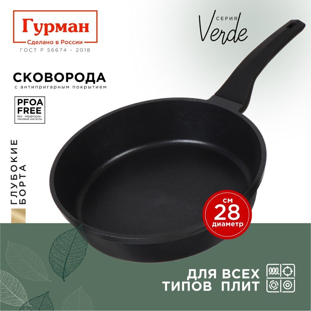 Сковорода литой алюминий 28 см Гурман Verde: быстро готовьте без пригорания, подходит для индукции и посудомойки — идеальный выбор для дома и дачи.