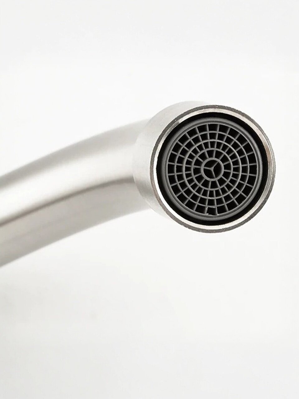 Корпус из нержавеющей стали устойчив к коррозии, сатиновое покрытие легко очищается, а вентильное управление и керамическая кран-букса обеспечивают плавную регулировку потока воды.
