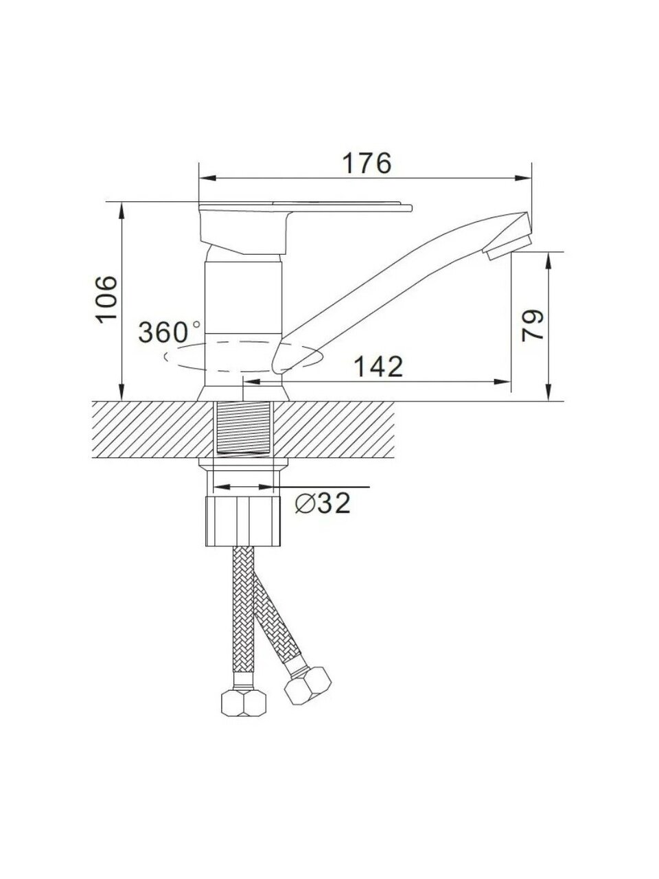 Смеситель рассчитан на горизонтальный монтаж в одно отверстие диаметром 35 мм. Подходит для большинства стандартных раковин с соответствующим отверстием.