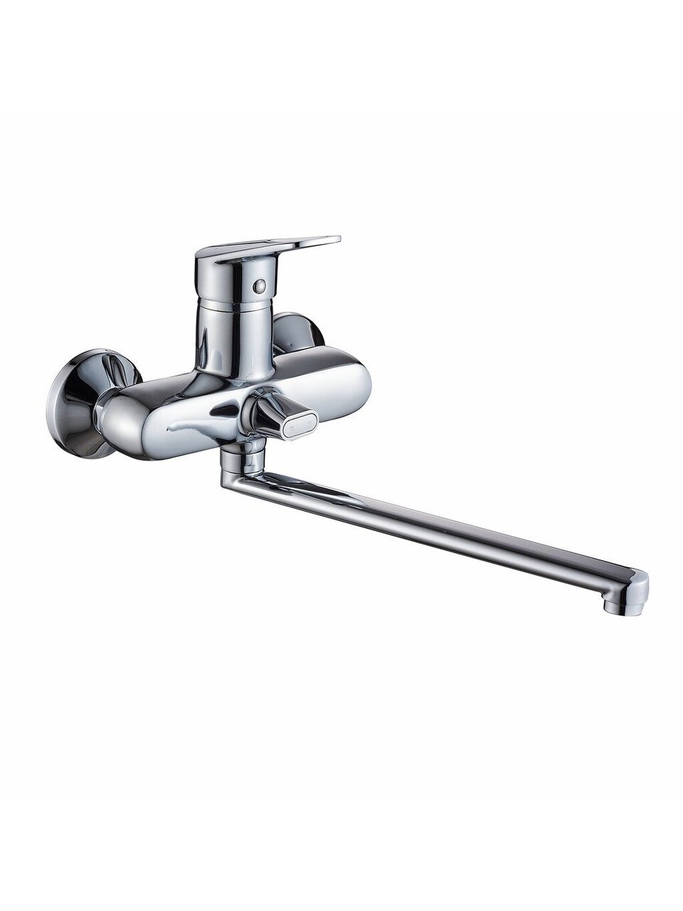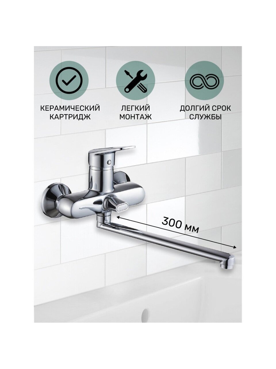 Длина излива — 30 см, что удобно для наполнения ванны и использования душа. Излив поворотный, подходит для разных сценариев использования.
