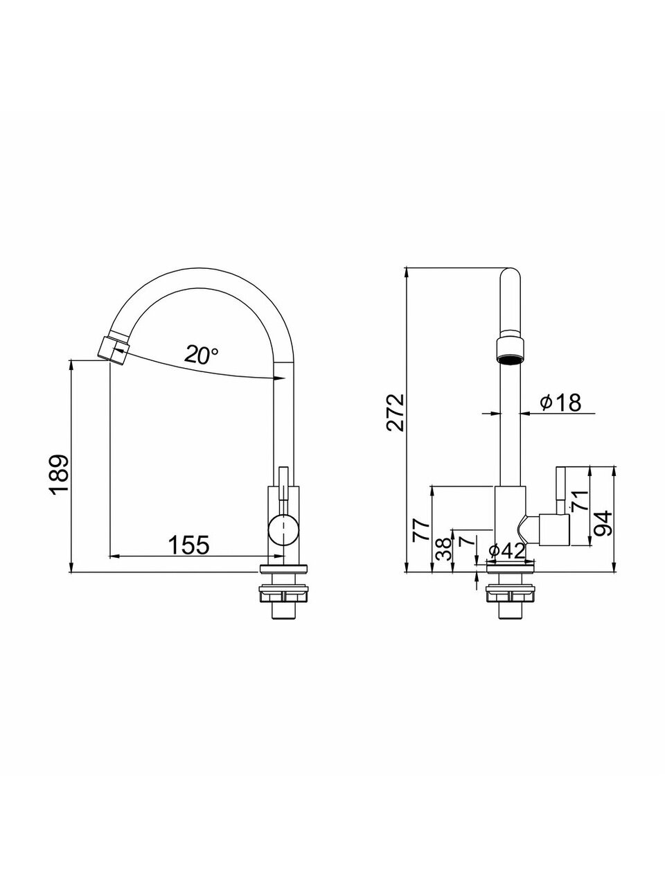 Высота излива — 18,9 см, длина — 15 см, монтажное отверстие — 42 мм. Крепится гайкой, стандарт подключения шланга — 1/2".