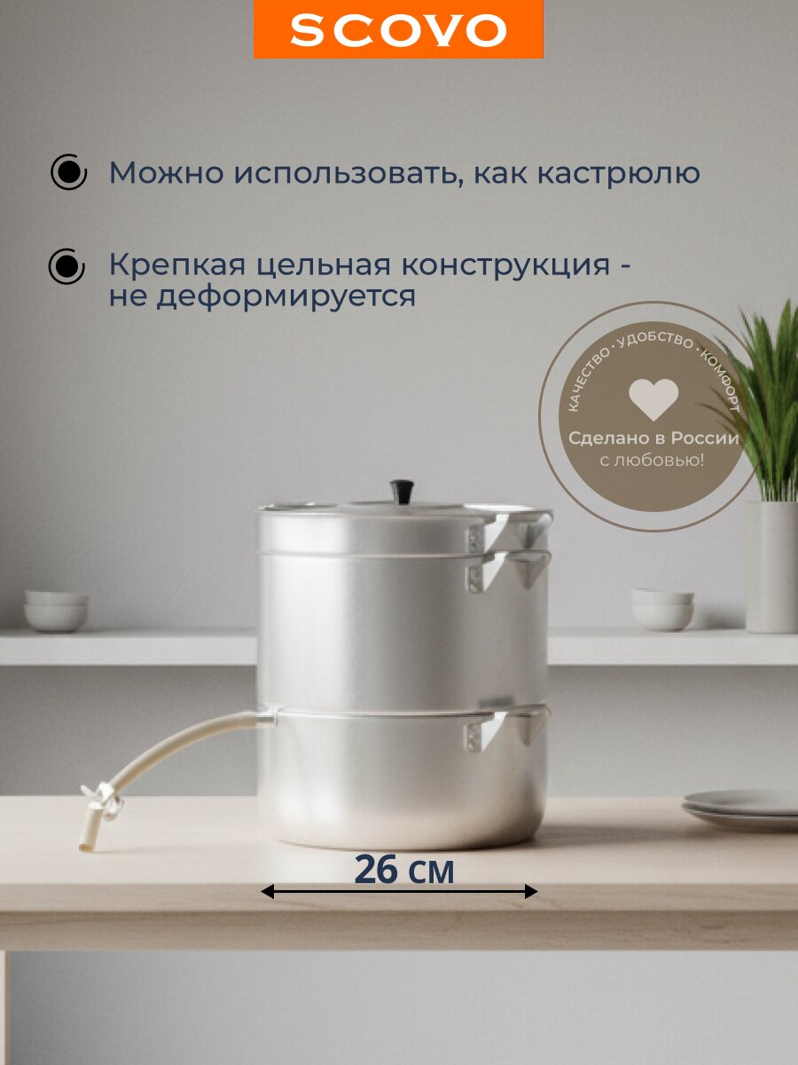 Запастись витаминами на долгие зимние дни поможет соковарка. Простота использования гарантирует, что с приготовлением соков справится даже начинающий кулинар! Многие предпочитают соки домашнего приготовления магазинным, и, порой, это становится проблемой, так как готовить соки в обычной посуде не очень удобно. Соковарка выполнена из пищевого алюминия, который быстро нагревается, а значит, позволит Вам достаточно быстро приготовить большое количество полезного фруктового сока.