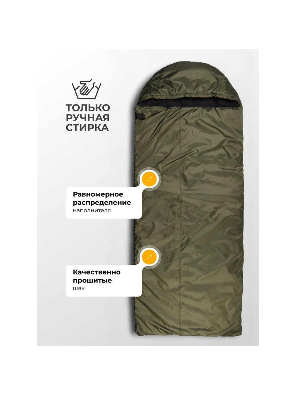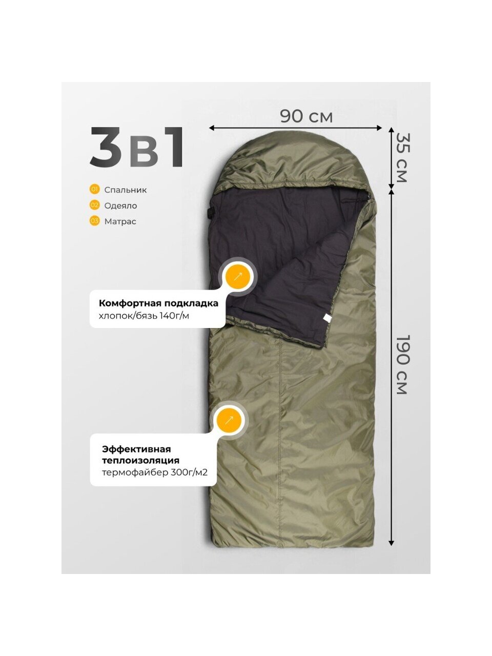 В основе спального мешка - инновационный наполнитель термофайбер плотностью 300г/м2, который обеспечивает надежную теплоизоляцию. Подкладка из хлопка и бязи плотностью 140г/м обеспечивает мягкость и комфорт, создавая приятные условия для сна.