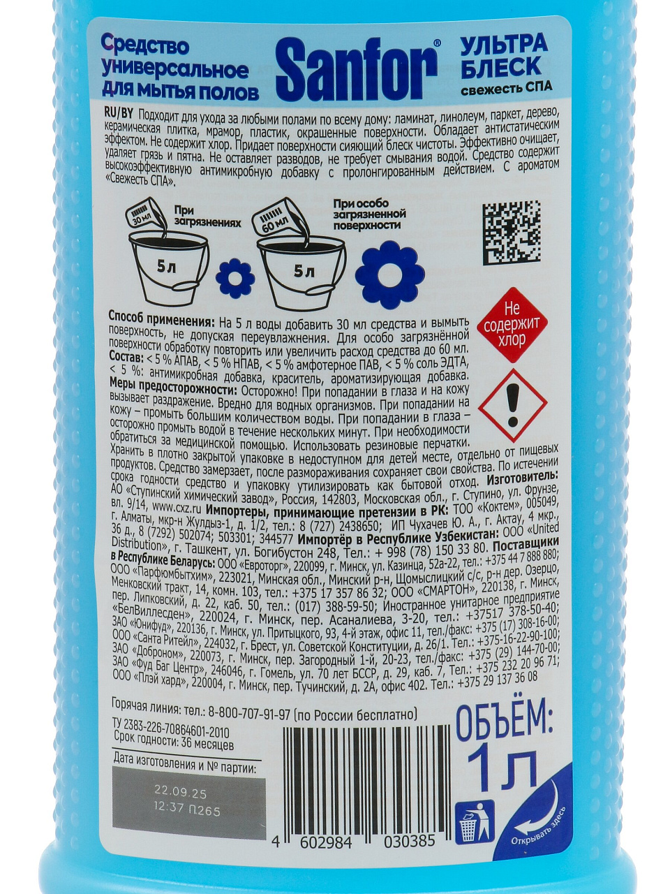 Средство для мытья полов Sanfor Ультра блеск: глубокая чистота, свежесть СПА и сияние полов — универсальное решение для дома и дачи, 1 л