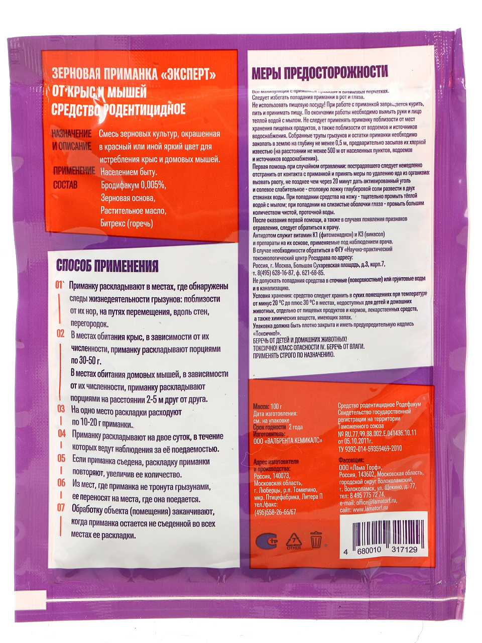 Форма выпуска — зерно, вес упаковки — 100 г, бренд — Эксперт, страна продавца — Россия, артикул Lt025419. Предназначен для борьбы с крысами и мышами.