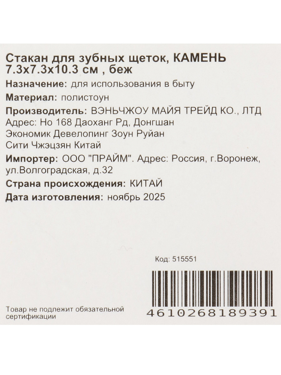 Стакан выполнен из полистоуна — это прочный композит, устойчивый к влаге и механическим воздействиям. Материал сохраняет матовую фактуру и бежевый цвет даже при активной эксплуатации.