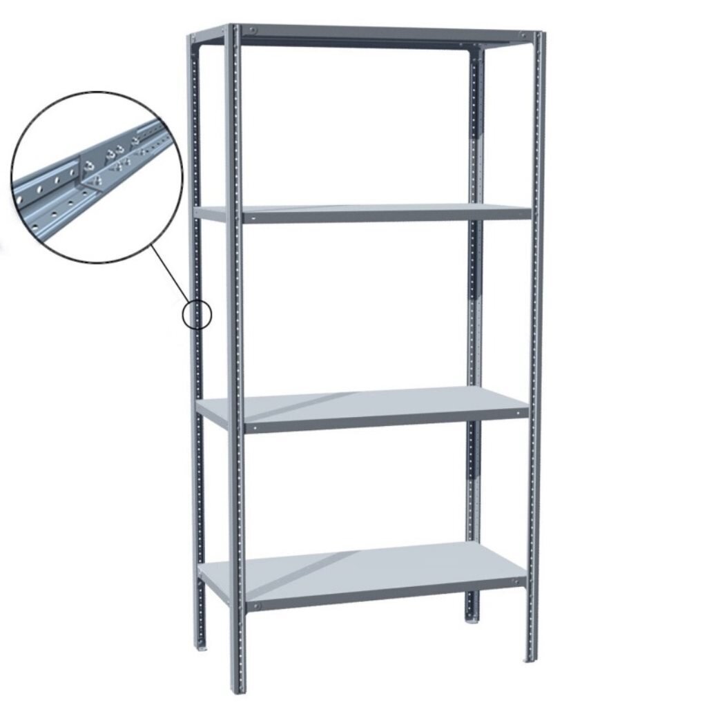Стеллаж является разрезным, стойки полки собираются из двух частей, и имеют крепление в центре, такие стеллажи более компактны при хранении в разобранном виде.