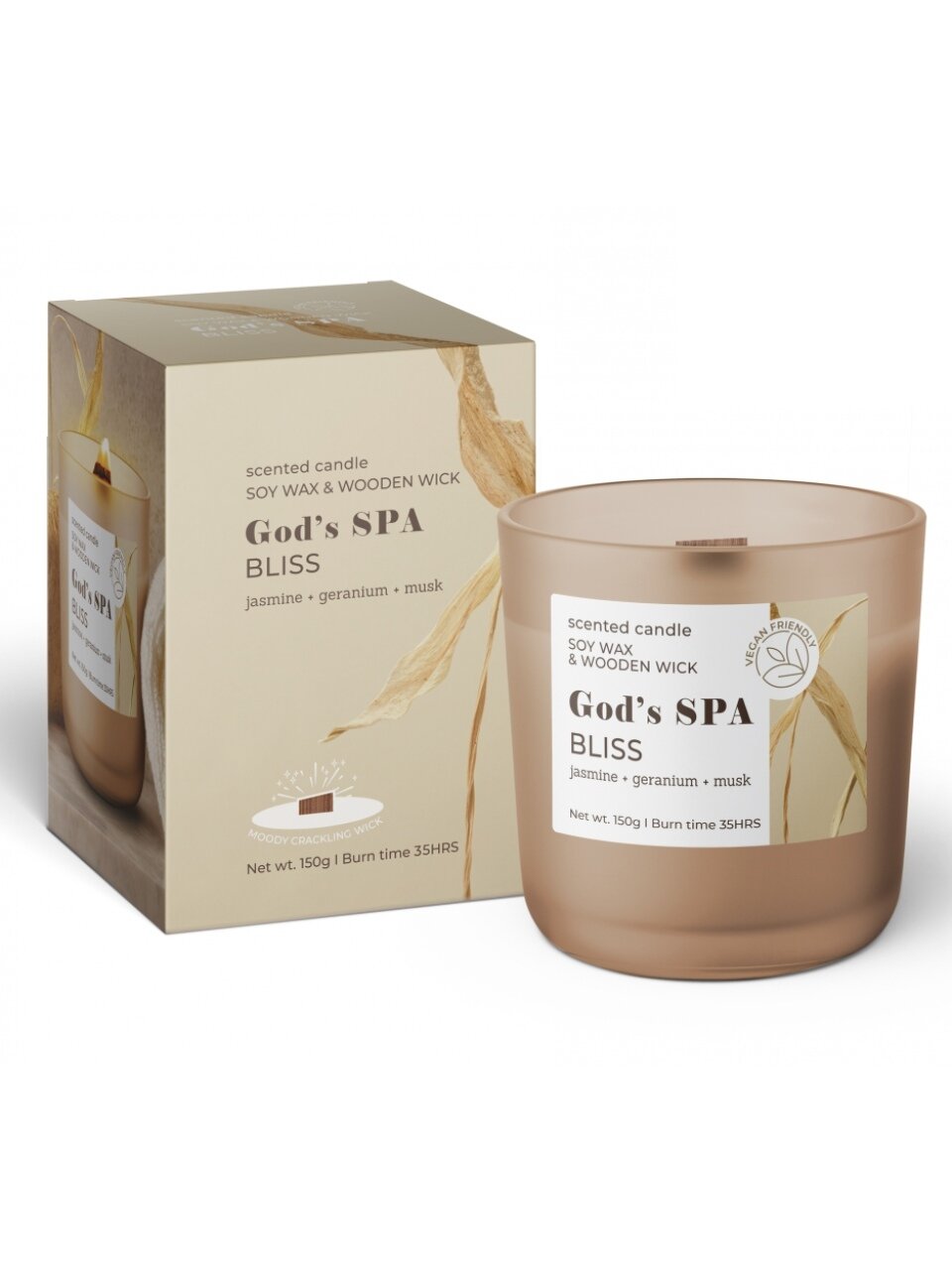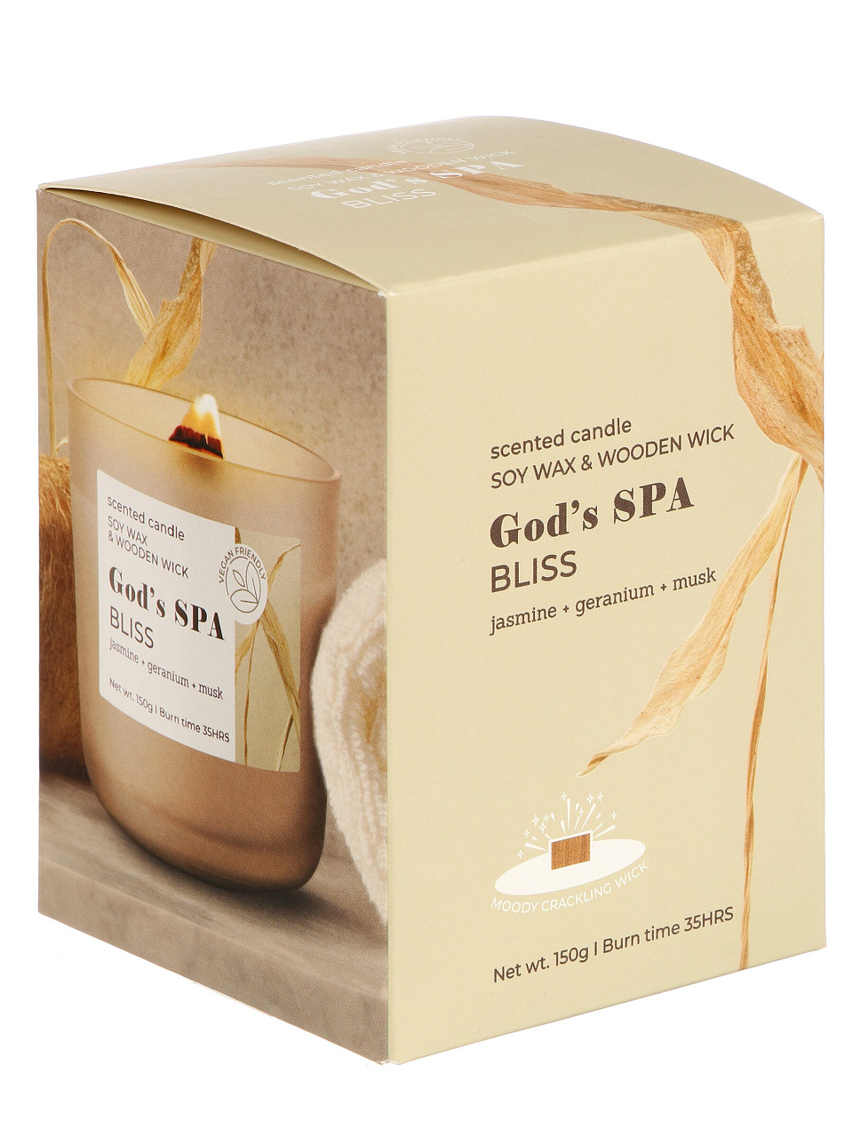 Свеча сочетает три ноты: жасмин (освежает), мускус (создаёт ощущение тепла), герань (снимает стресс). Аромат раскрывается мягко, подходит для небольших и средних помещений.