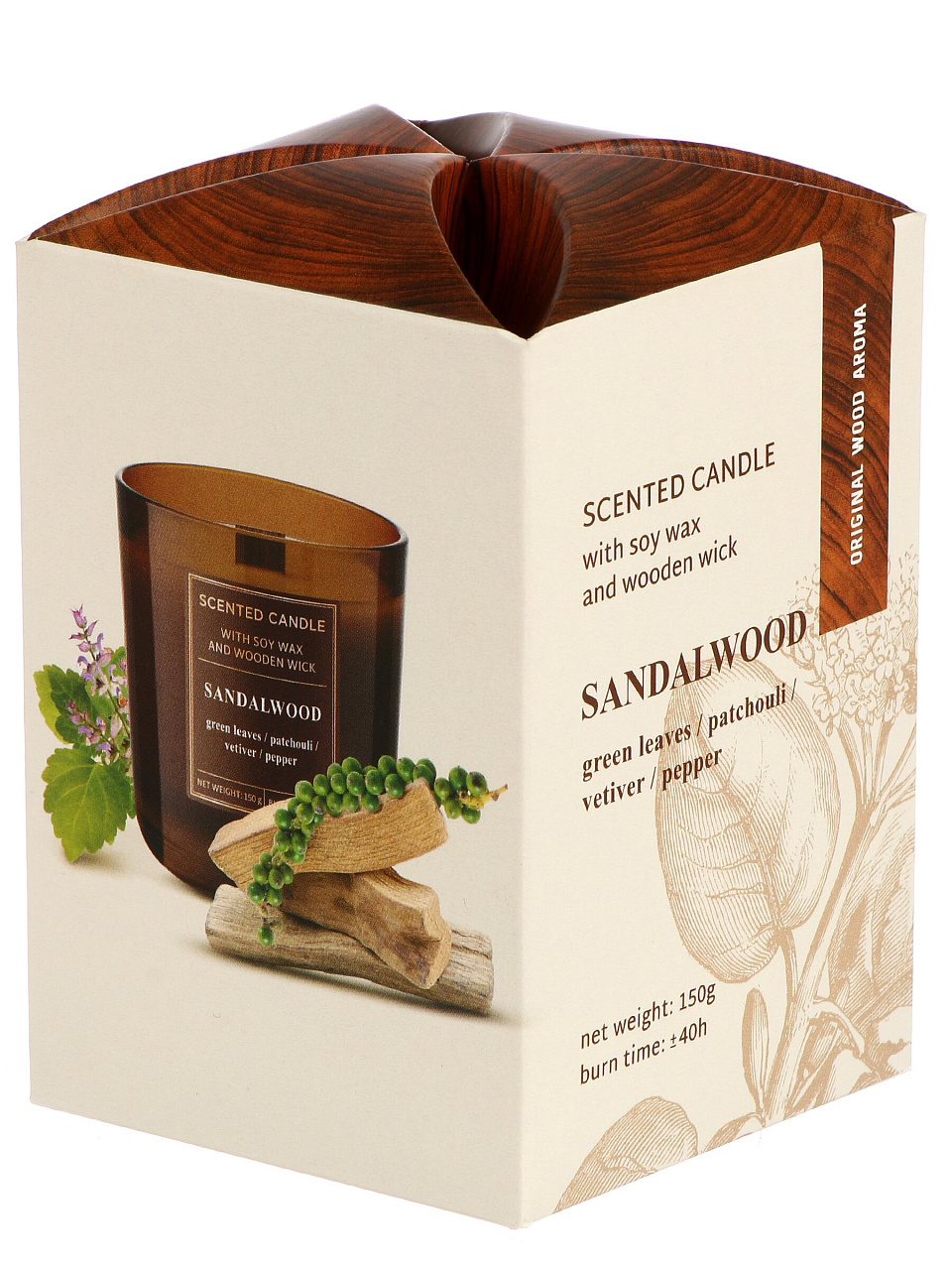Свеча сочетает свежие зелёные ноты, древесный акцент пачули, ветивера и пряный перец — сложный, но ненавязчивый аромат для расслабления.