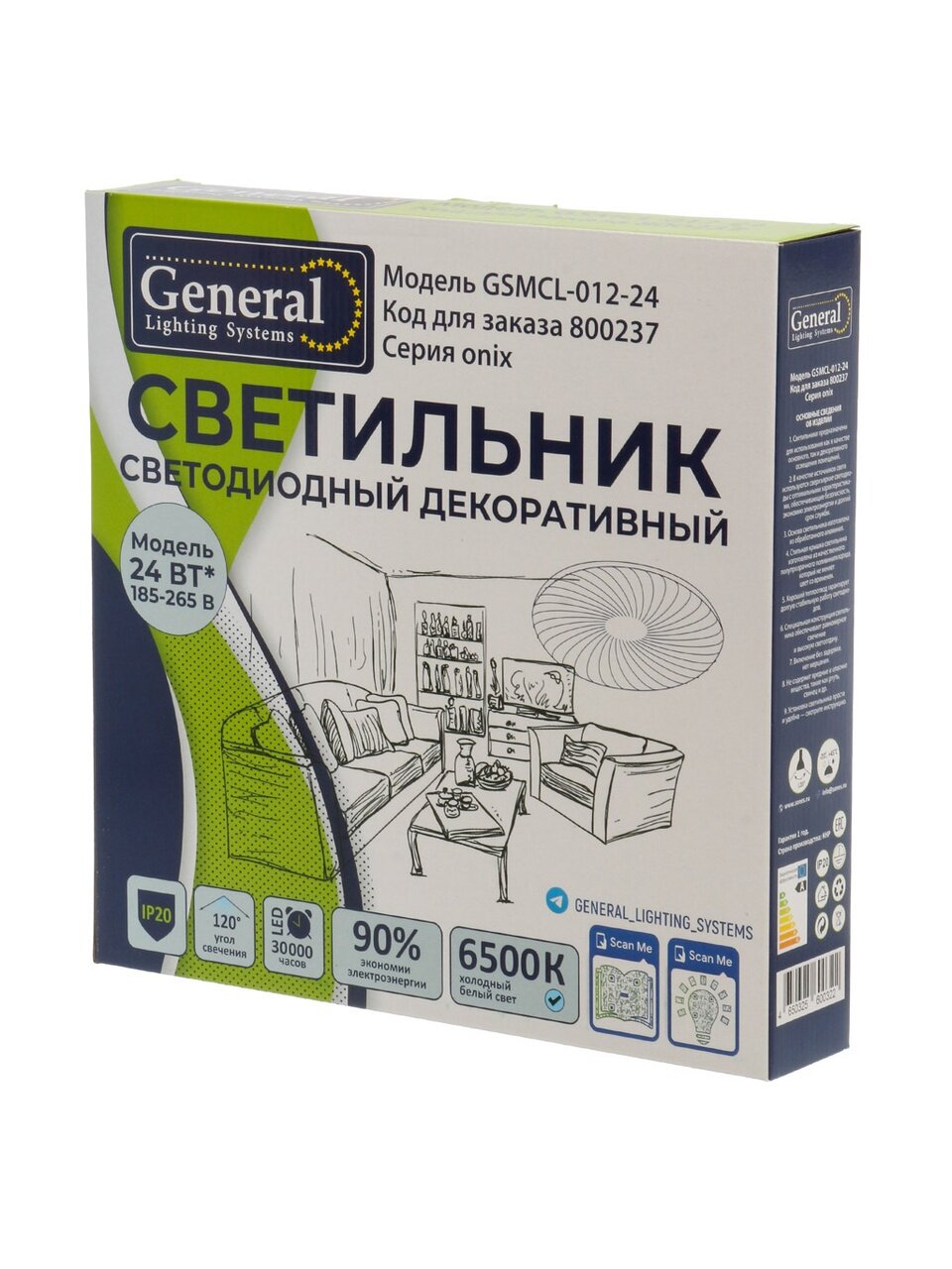Модель General GSMCL-012-24 Onix с холодным белым светом (6500 К) и мощностью 24 Вт обеспечивает отличную яркость и равномерное освещение, идеально подходит для кухни, прихожей и рабочих зон.