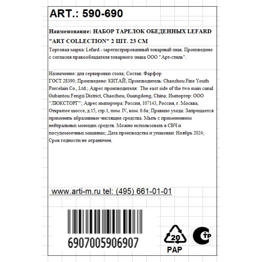 Вы можете приобрести «Набор тарелок обеденный, фарфор, 2 шт, 23 см, круглый, Art Collection, Lefard, 590-690» и другие товары в нашем интернет-магазине в Таганроге по низким ценам и с бесплатным самовывозом.
