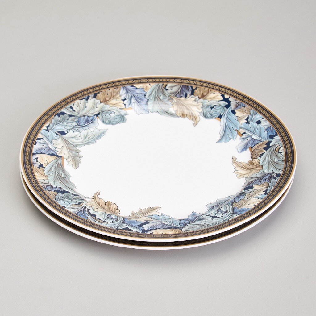 Диаметр каждой тарелки — 20.5 см, форма круглая, материал — прочный фарфор с синим рисунком листьев.