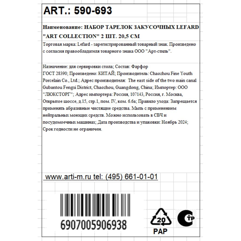 Вы можете приобрести «Набор тарелок закусочный, фарфор, 2 шт, 20.5 см, круглый, Art Collection, Lefard, 590-693» и другие товары в нашем интернет-магазине в Ельце по низким ценам и с бесплатным самовывозом.