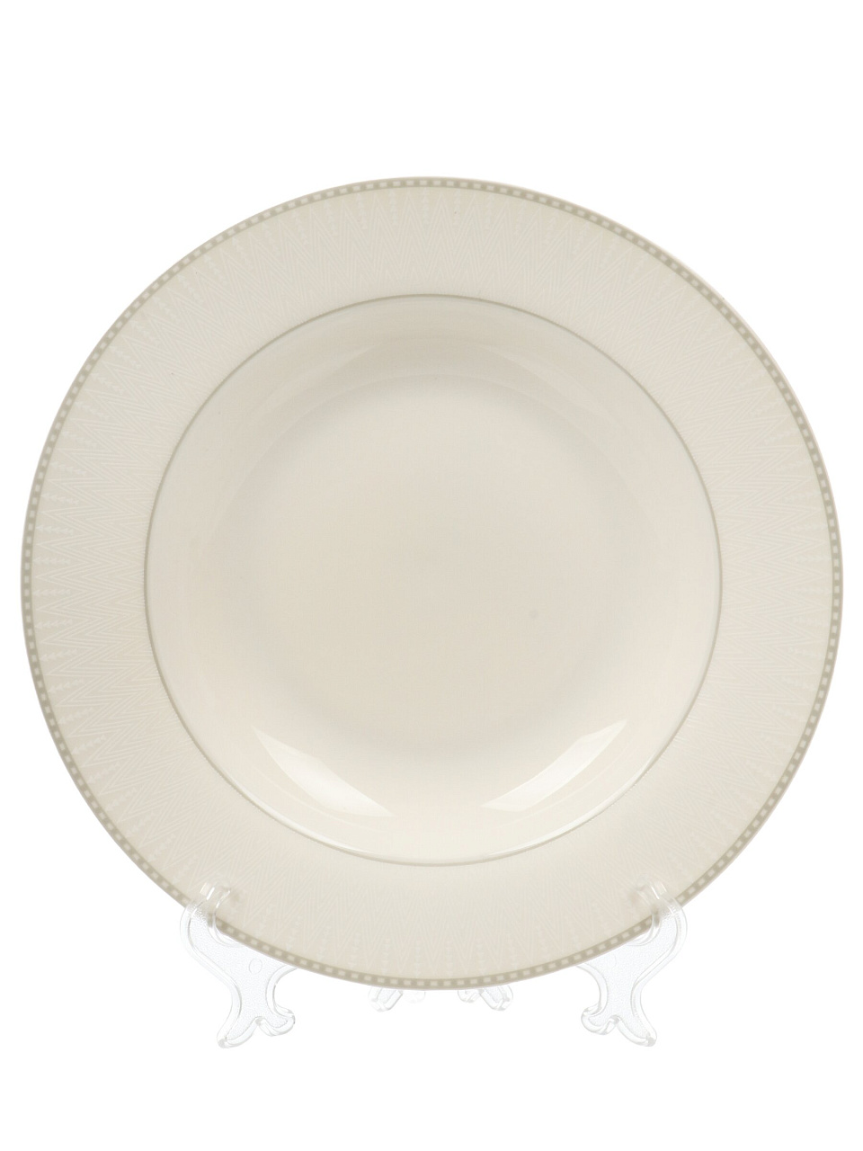 Диаметр 23 см, круглая форма, фарфор, белый цвет с узором, высота и глубина оптимальны для первых блюд и закусок. Количество в комплекте — 1 штука.