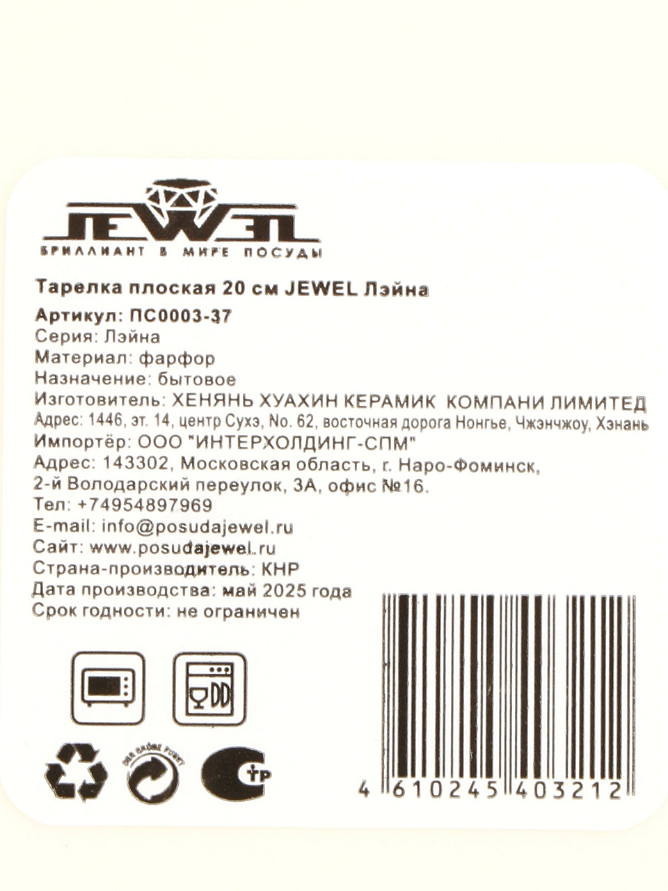Тарелка десертная, фарфор, 20 см, круглая, Лейна, Jewel, ПС0003-37, белая