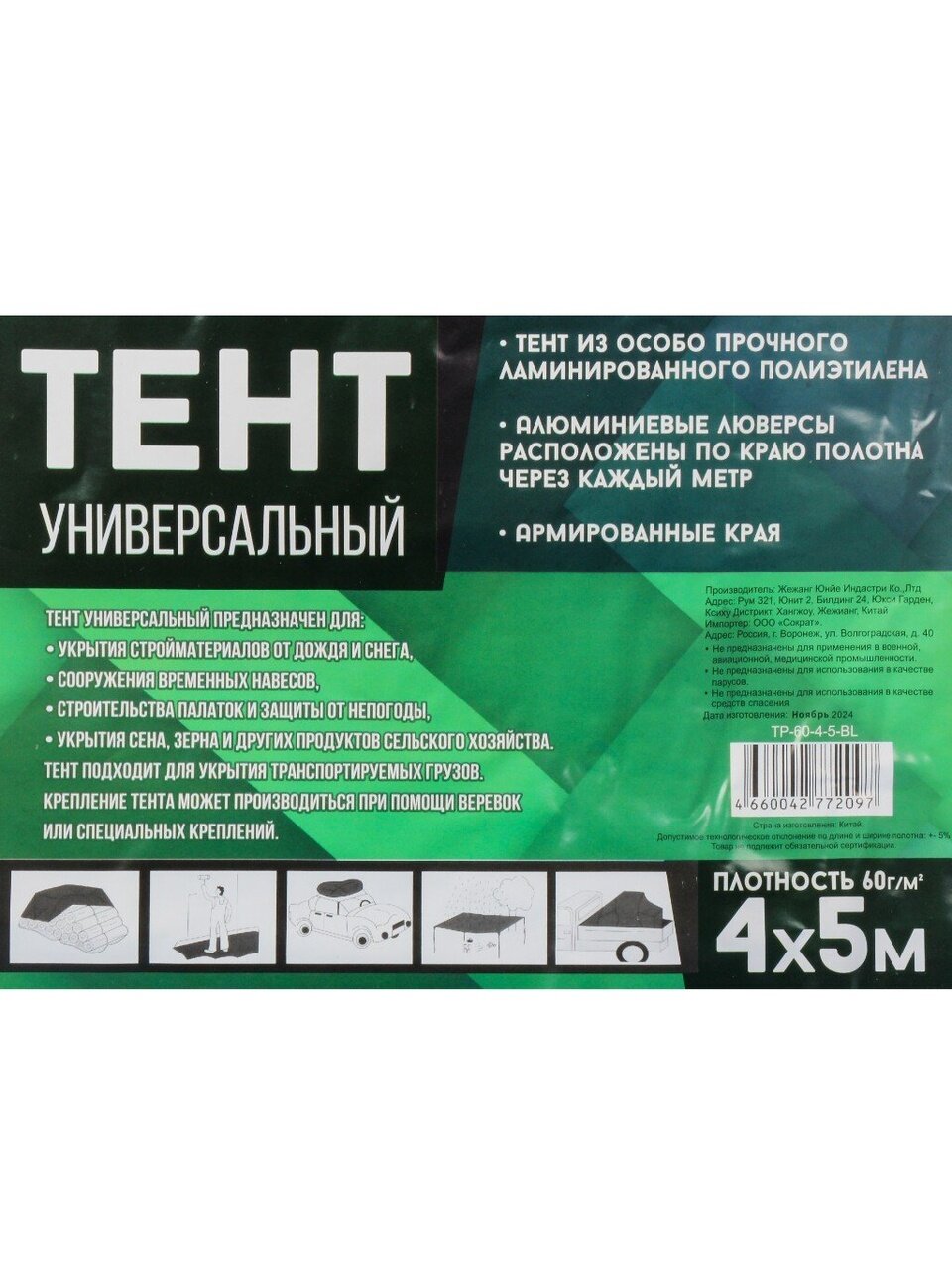Тент универсальный 500х400 см — надежное решение для защиты от дождя, солнца и града. Универсальный прямоугольный тент из полиэтилена плотностью 60 г/м2 станет незаменимым помощником для хозяйственных, строительных, туристических, садовых и дачных задач. Благодаря крупному размеру 500х400 см и прочным алюминиевым люверсам, расположенным по краю полотна через каждый метр, легко организовать навес, укрыть стройматериалы, садовую мебель, автомобиль или урожай.