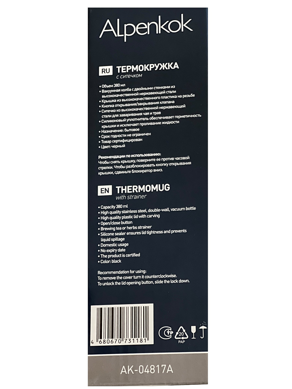 Вы можете приобрести «Термокружка нержавеющая сталь, 0.38 л, Alpenkok, колба нержавеющая сталь, с ситечком, вакуумная, черная, AK-04817A» и другие товары в нашем интернет-магазине в Астрахани по низким ценам и с бесплатным самовывозом.
