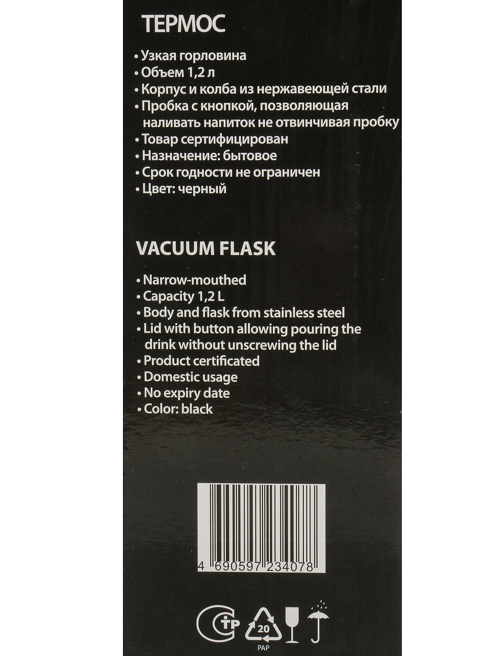 Объём — 1,2 литра, корпус и колба выполнены из нержавеющей стали, цвет — чёрный, крышка с клапаном для безопасности.