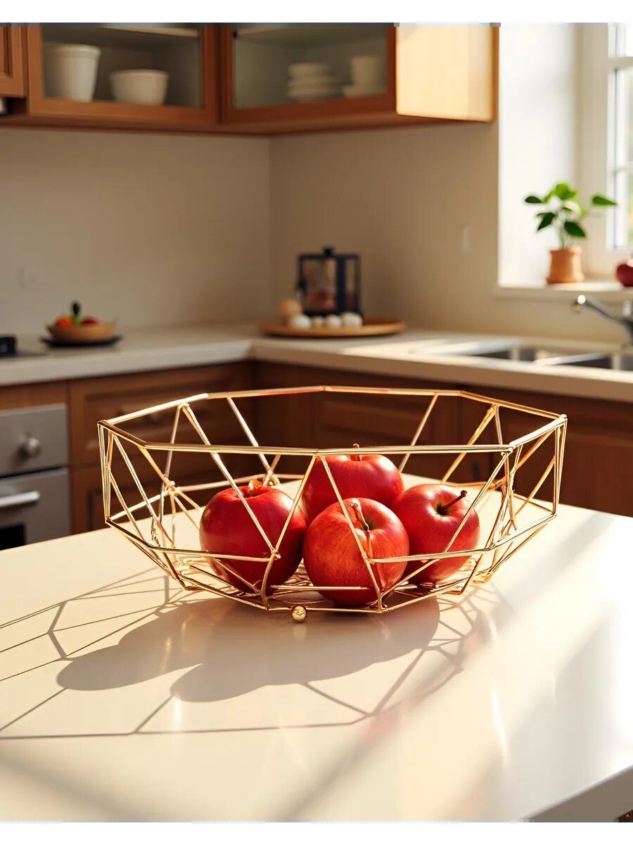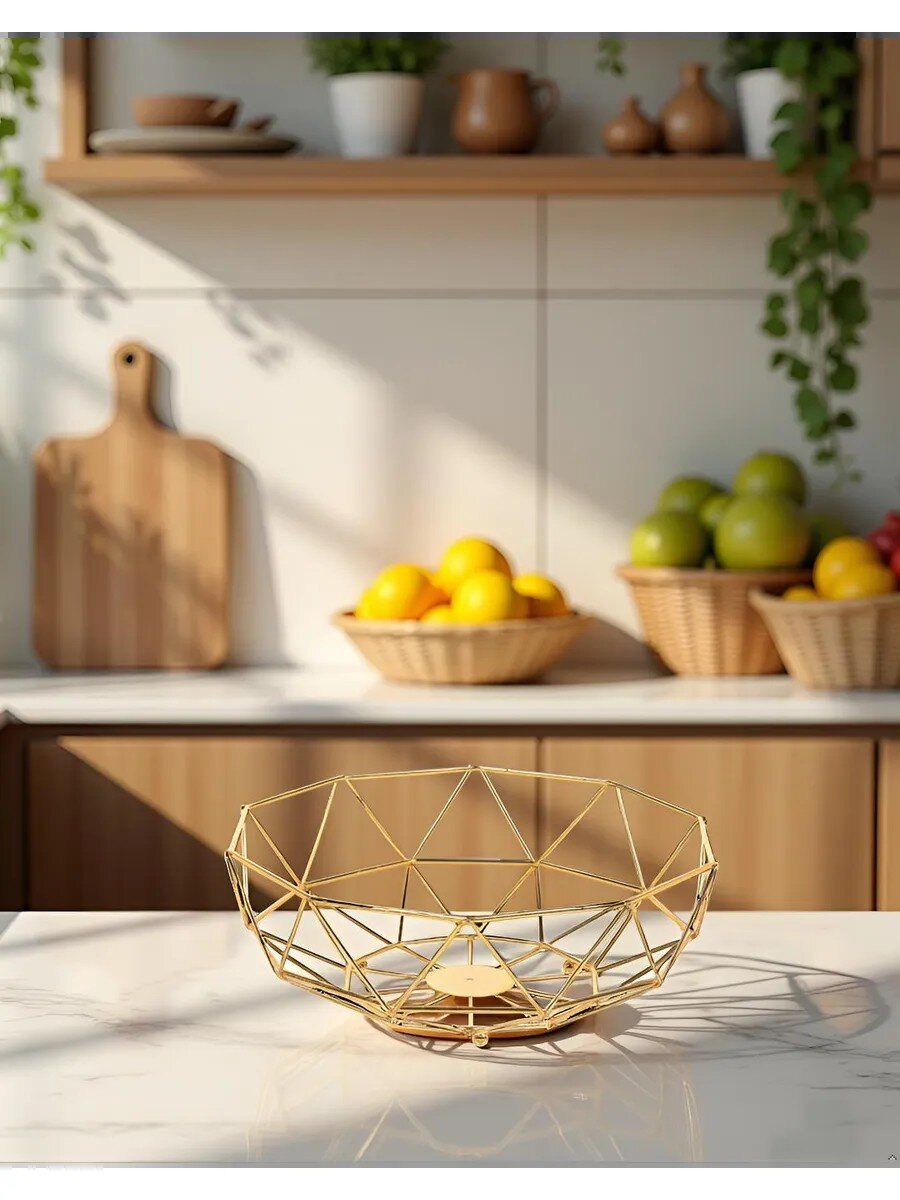 Стильная металлическая корзина для фруктов впишется в любой интерьер Вашего дома и всегда будет радовать Вас и Ваших гостей. Корзина имеет оригинальный геометрический дизайн.