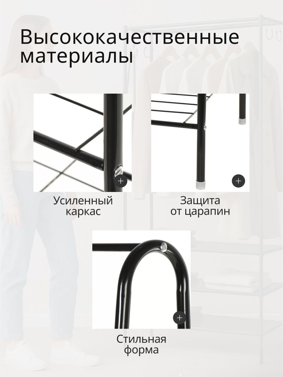 Металлическая конструкция рассчитана на повседневные нагрузки: можно размещать несколько курток, пальто, рубашек и аксессуаров без риска деформации. Для равномерного распределения веса рекомендуется не превышать 15–20 кг.