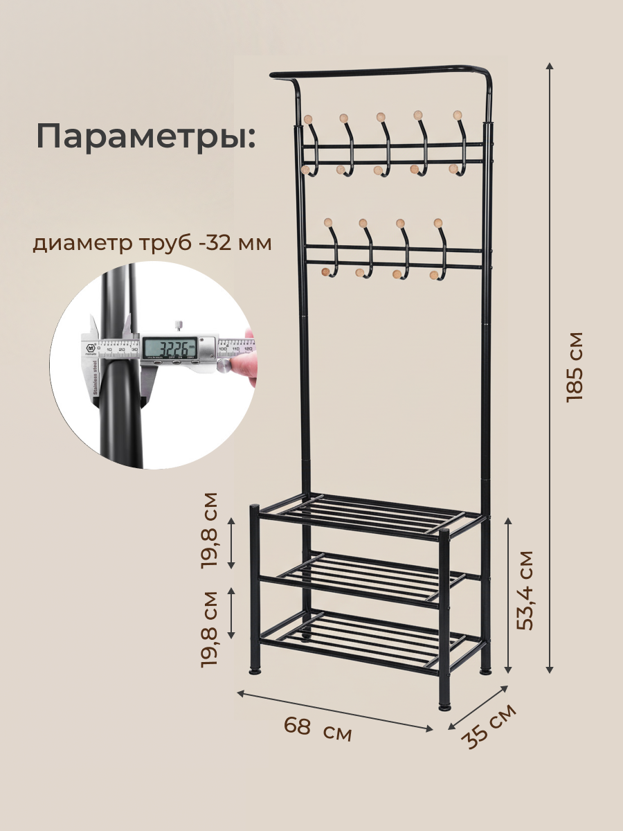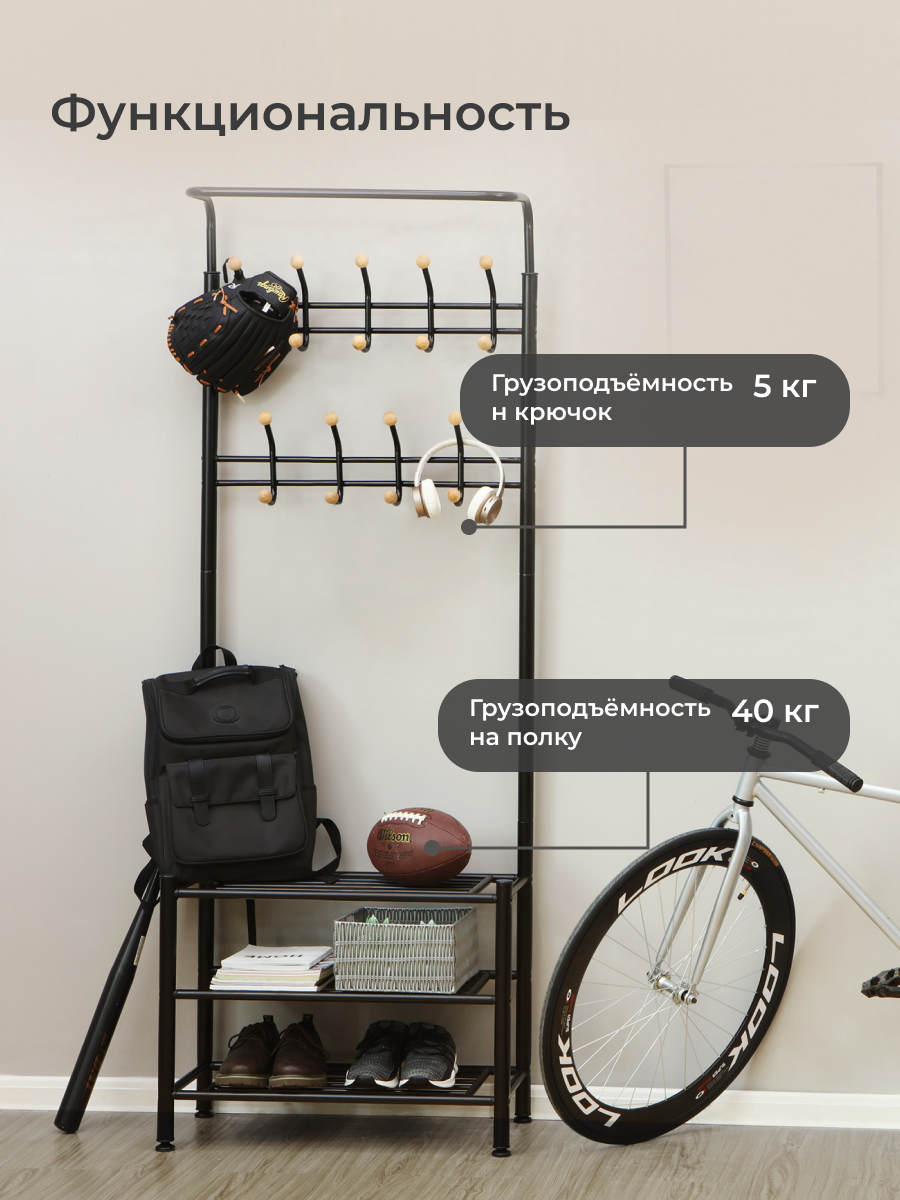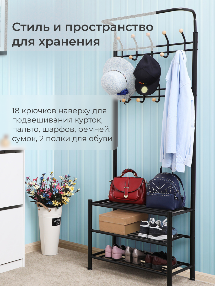 Как использовать: просто соберите по инструкции, разместите в прихожей или гардеробной, распределите одежду на крючках и обувь на нижней полке. Подходит для хранения пальто, курток, аксессуаров и обуви, а также как временное решение для гостей.