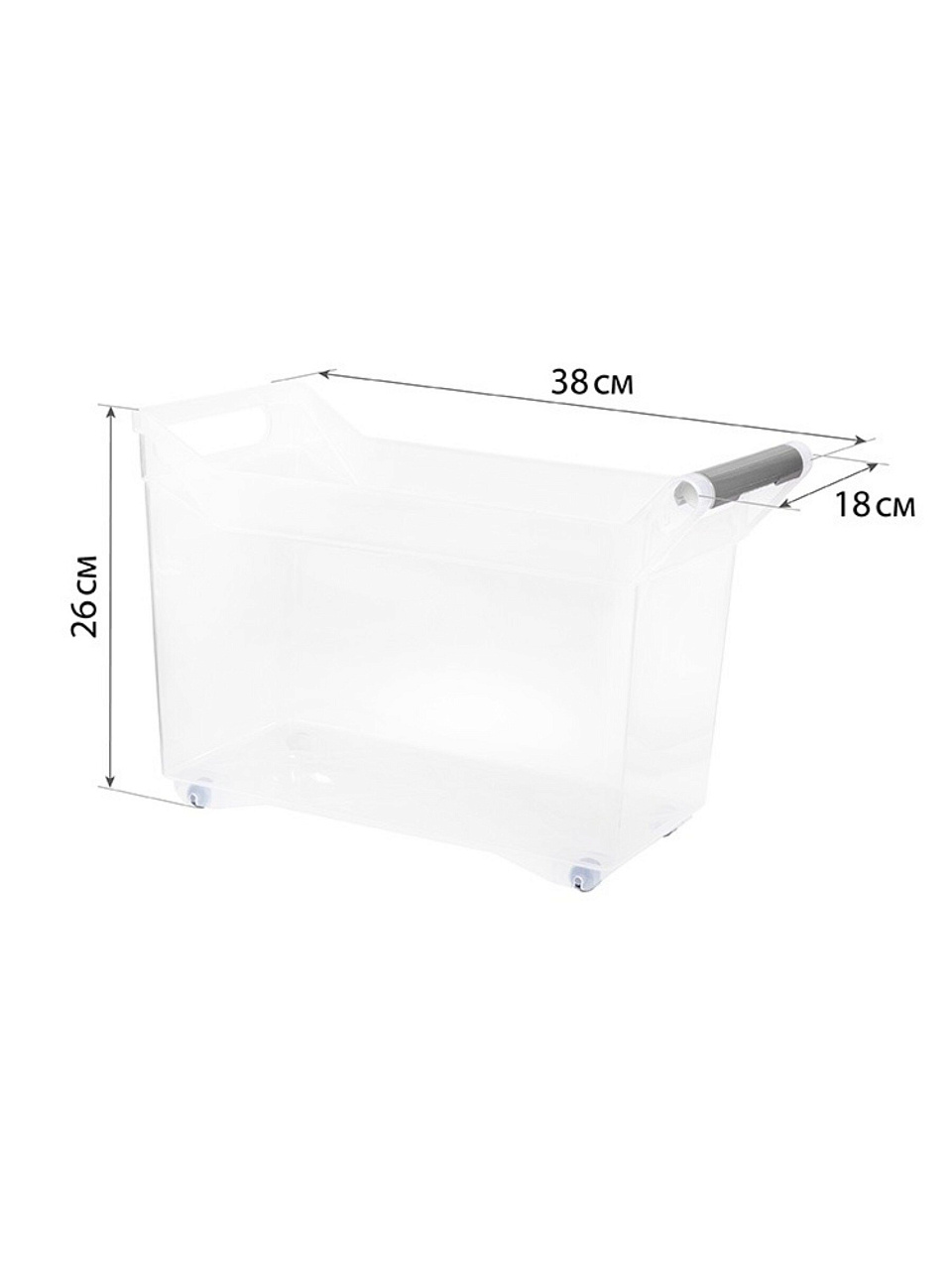 Габариты: длина 18 см, ширина 38 см, высота 26 см. Объем — 10.5 литра. Прямоугольная форма позволяет удобно размещать контейнер в шкафах или кладовых.